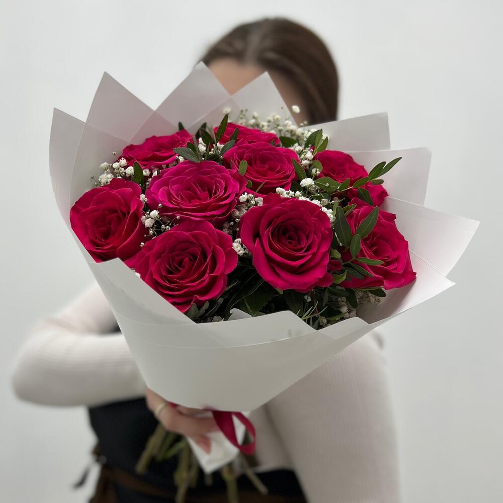 Гипсофила – 2 шт.Роза – 9 шт.Упаковка дизайнерская – 1 шт.
