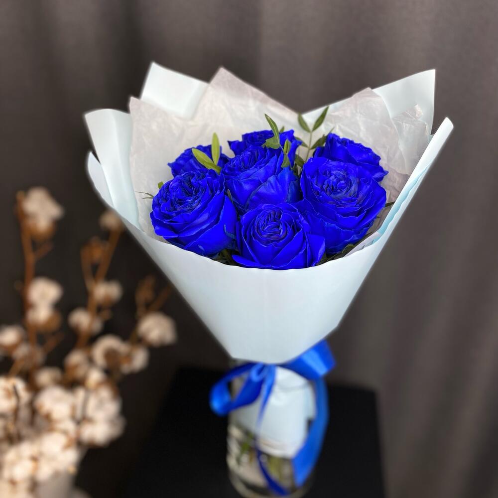 Лента атласная – 1 шт.Тишью – 1 шт.Фисташка – 2 шт.Синяя роза – 7 шт.Матовая упаковка – 1 шт.